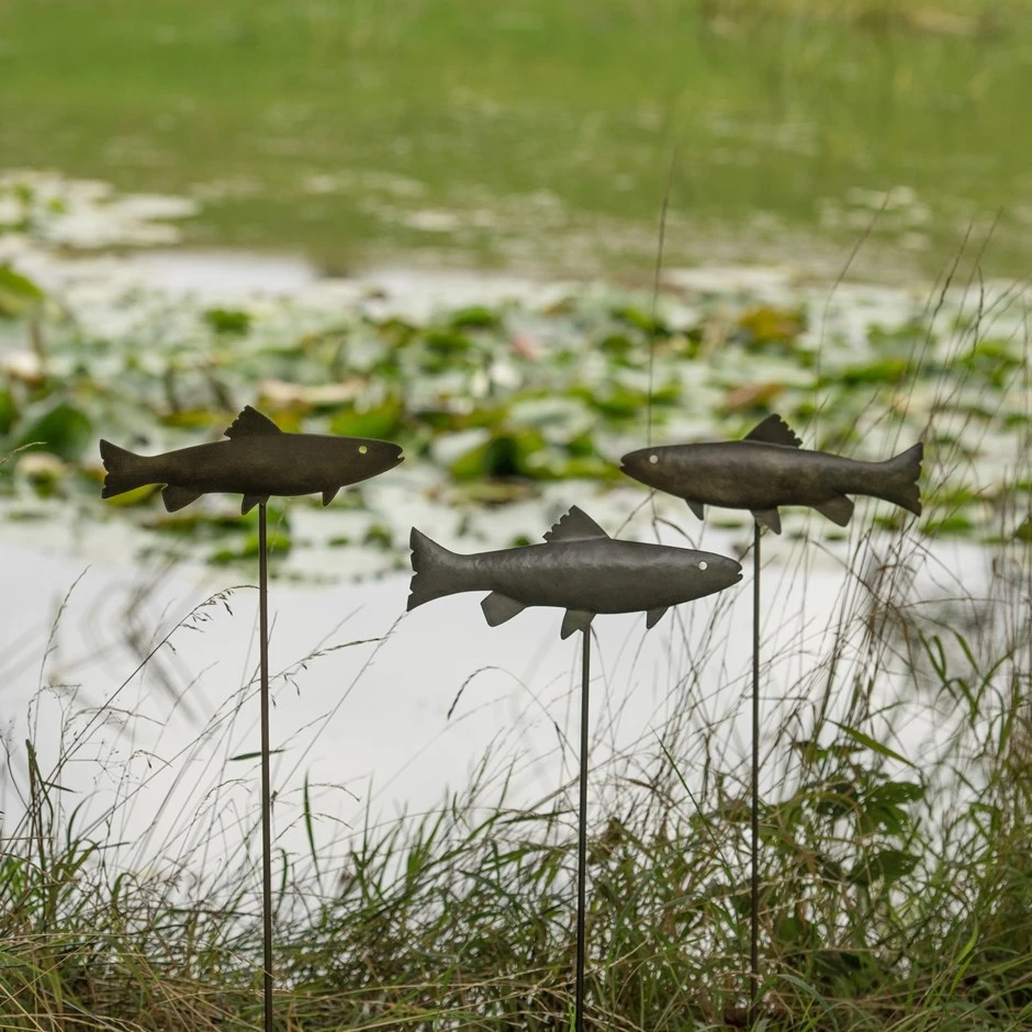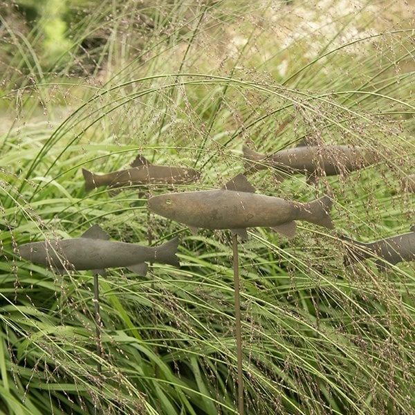 Made from steel with a pewter powder coat, the fish simply screw onto the stakes to assemble. Their double-sided design means you can have them swimming in either direction.