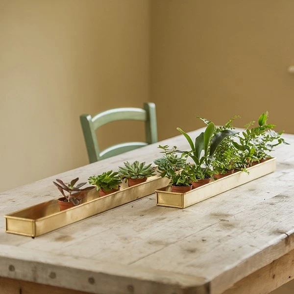 Made from solid brushed brass, these elegant long troughs are ideal for filling with small pots. Perfect for creating a striking linear display for a mantelpiece, table or windowsill.