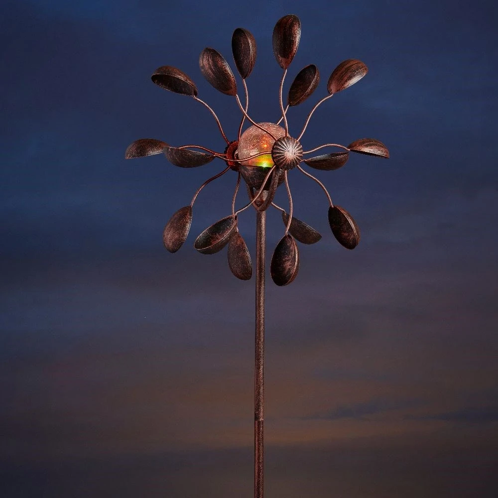 Double-sided spinner featuring decorative cupped wind catchers and a crackle glaze light ball with colour-changing solar LED.