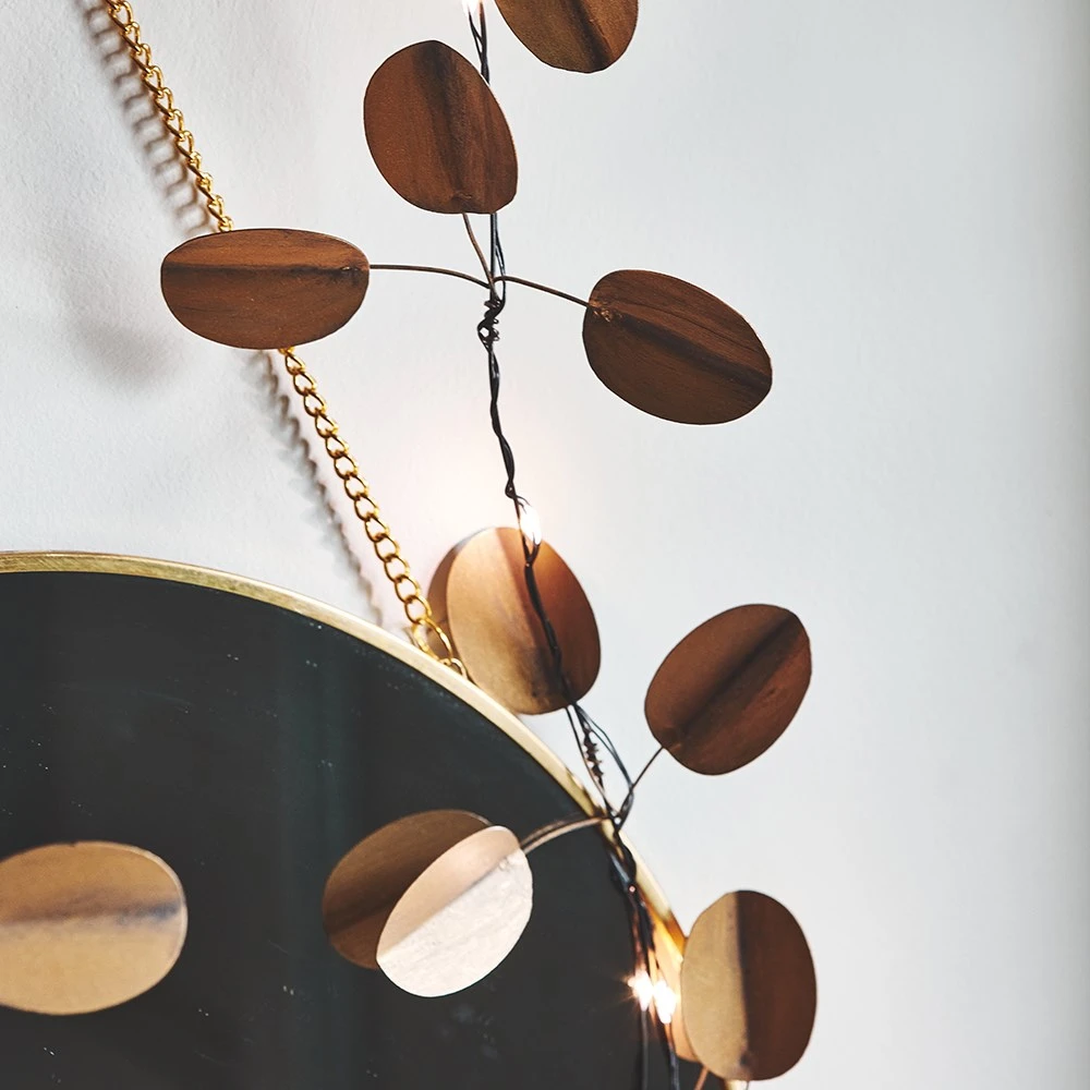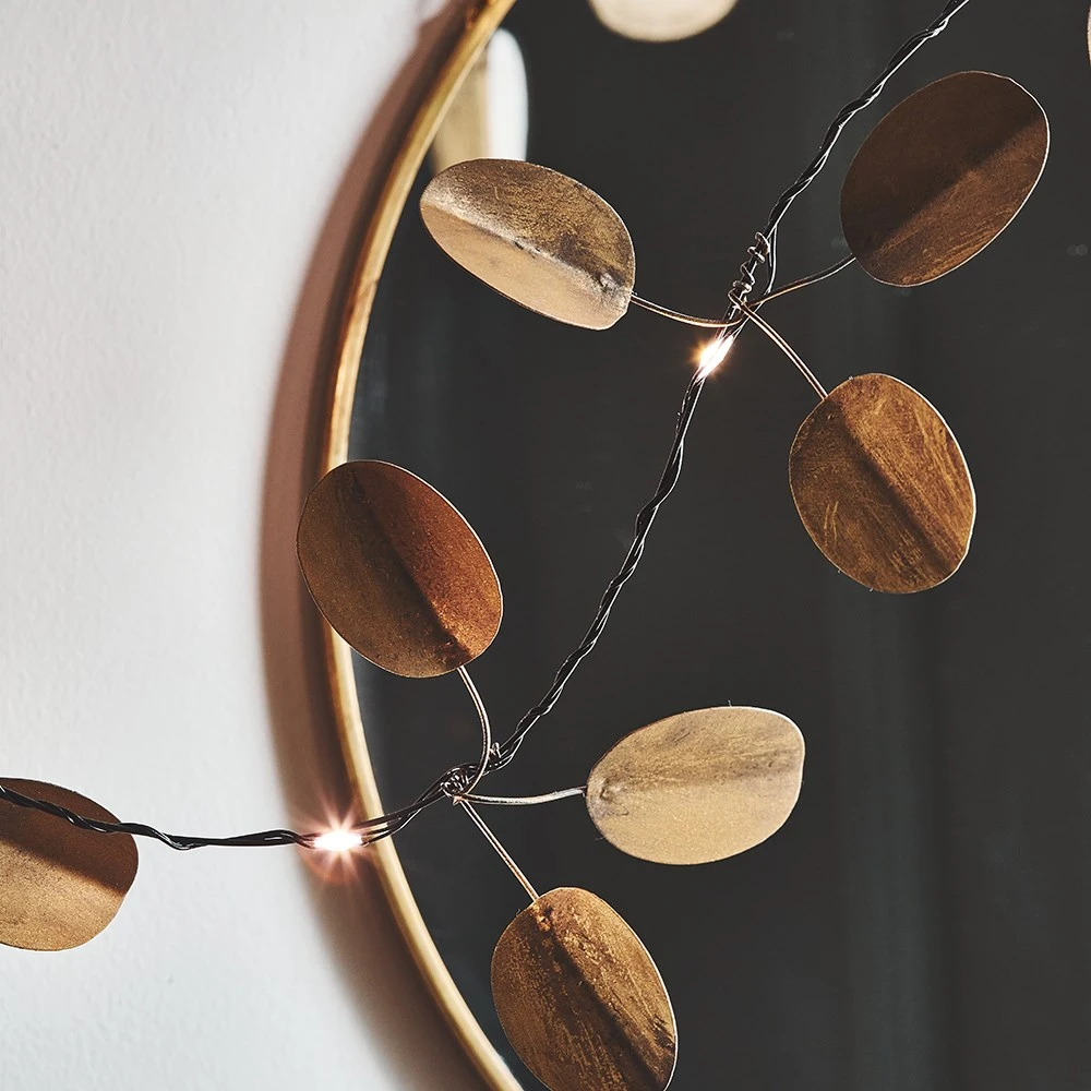 This gold eucalyptus light-up garland features mouldable wire stems so you can bend and style it into shape. The 20 warm white LEDs play off the metallic gold leaves, creating a beautiful burnished glow. Battery powered and suitable for both indoor and outdoor use, it’s easy to place anywhere in your home or garden.
