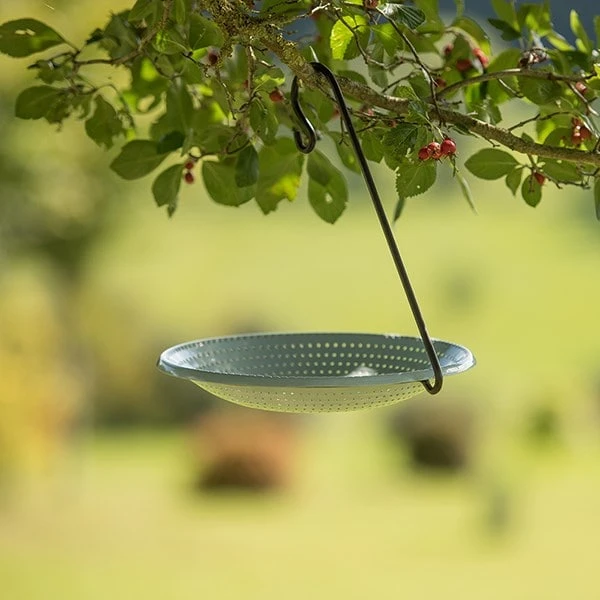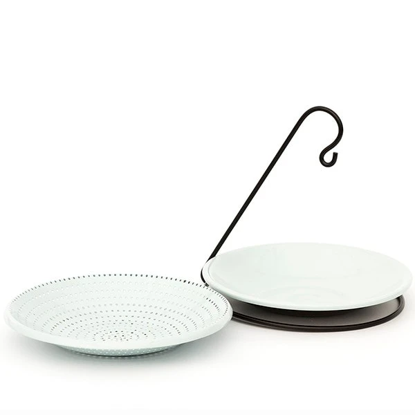 The perforated dish lets rainwater drain away to keep food fresh and dry, while the solid dish makes a perfect pit stop for drinking and bathing. Simply choose your dish and slide into the hanger.