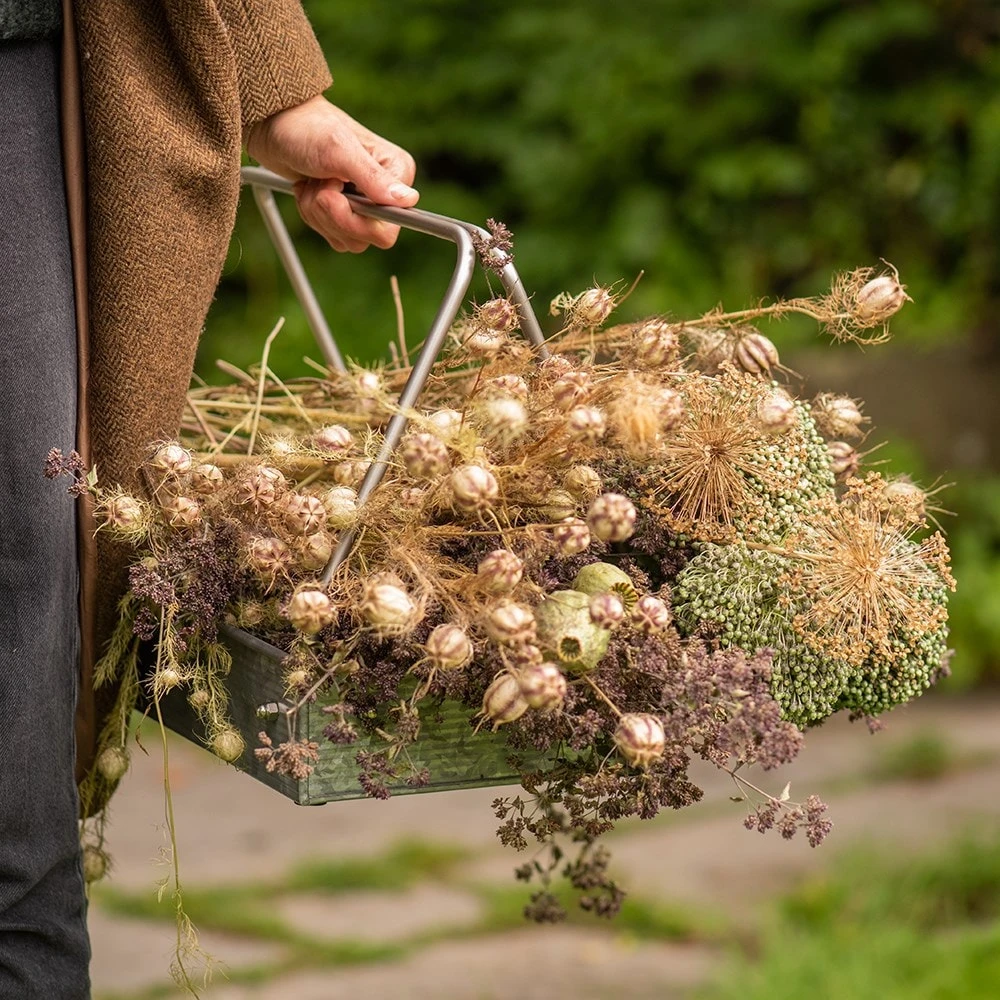 Our ribbed metal caddy makes a handy garden companion, offering an easy way to store and carry essential tools and supplies.