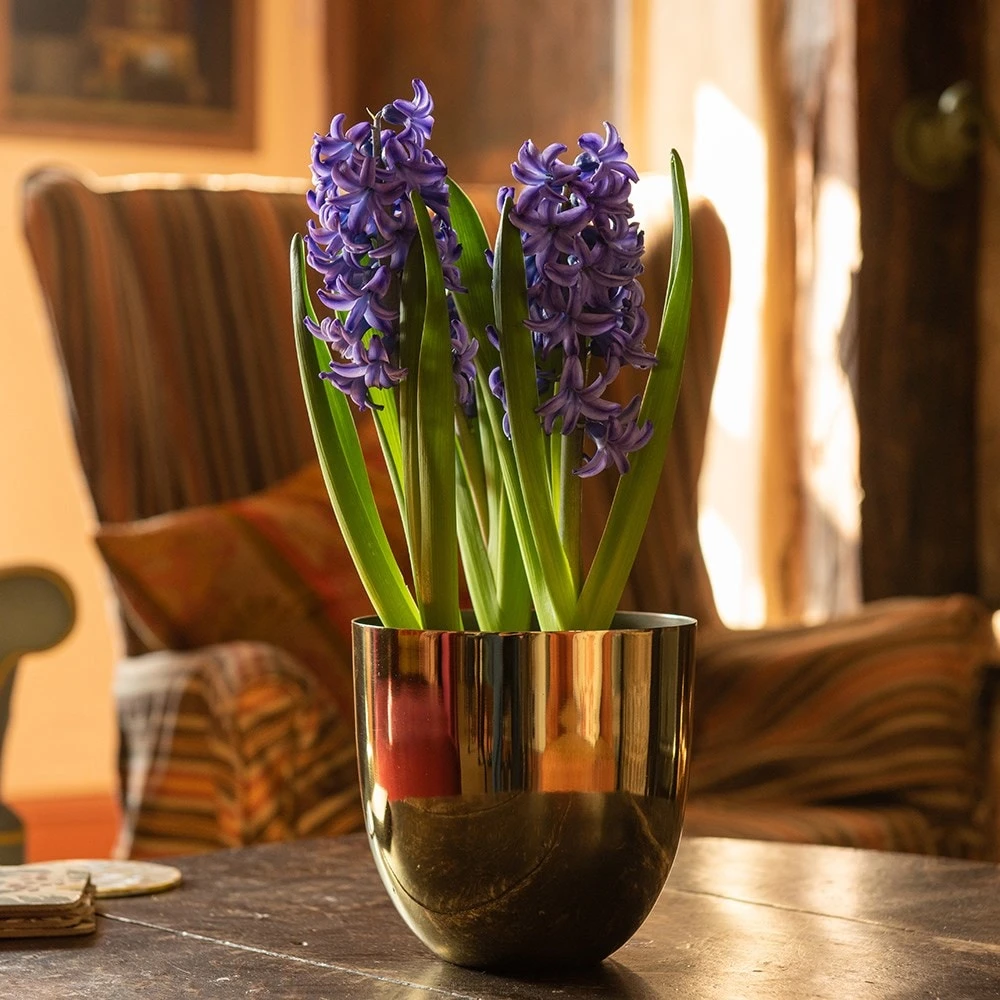 Stunning high-shine metallic pot cover made from steel with a polished brass exterior and powder-coated matt black interior. Supplied without drainage holes for indoor use.