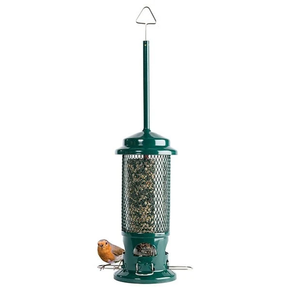 Suitable for seed and blends, the clever design features a humane weight-activated mechanism. As soon as a squirrel climbs on, their weight forces down the metal shroud to block access to the seed feeder ports.